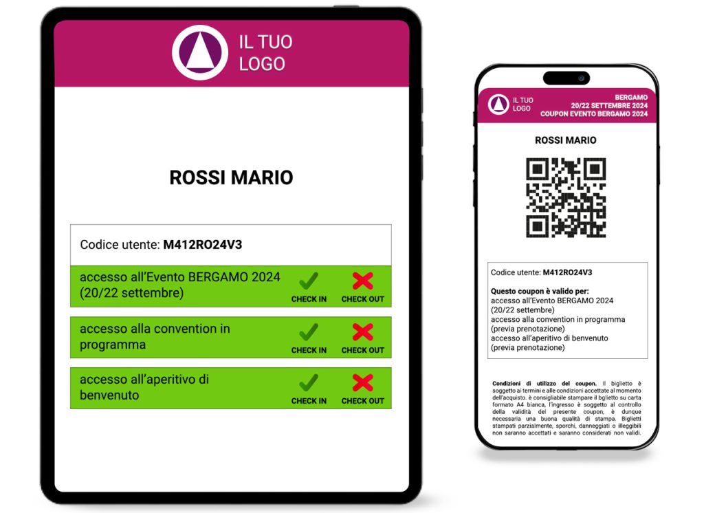 Creazione di coupon personali stampabili dotati di QR code identificativo per una rapida gestione degli accessi all’evento.
